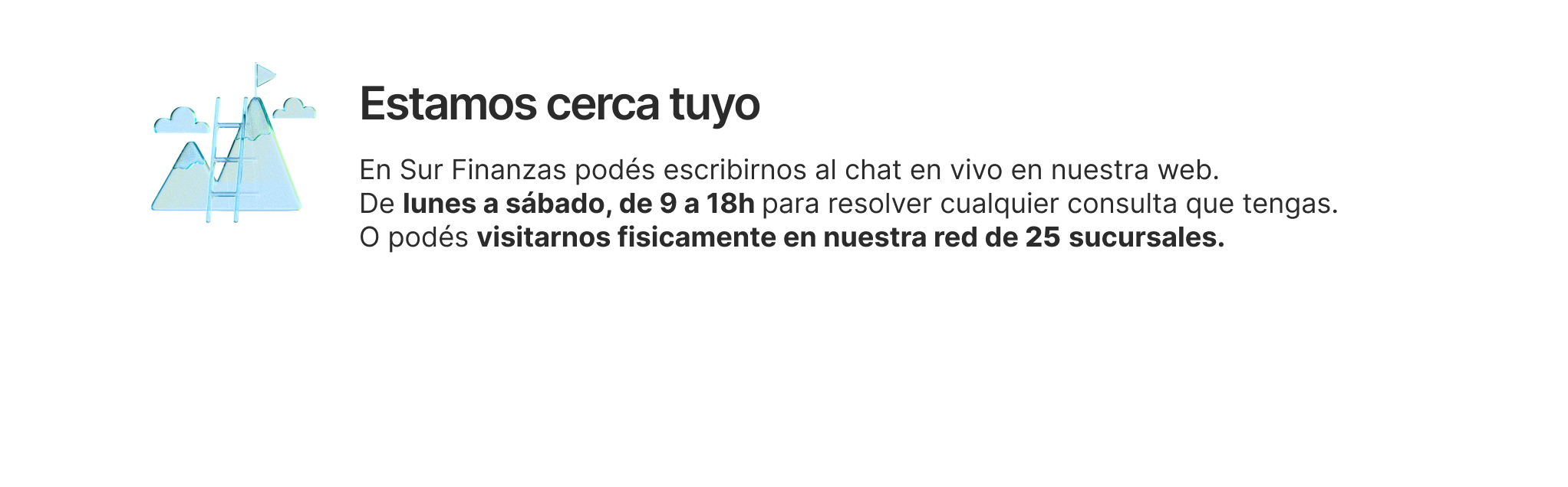 Sur Finanzas Group S.A. Cuit 30-71740402-1 Proveedor de crédito no financiero habilitado por el BCRA registro número 55.380. Domicilio legal Suipacha 472, Local 7, CABA, Argentina.